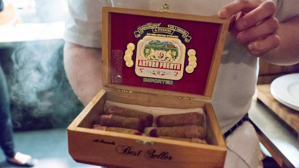 A barrel-aged Gentleman Jack "Negroni"[1] started the festivities, along with a few passed "bar snacks," all with clever, fun presentations. Smoked sweet potato croquette "cigars" were served in a cigar box billowing with smoke; foie gras "roll ups" wrapped in strawberry fruit leather and sprinkled with pistachios stuck up out of a field of greens planted in a box; and best of all, crispy chicharron-like beef tendon "frazzles" which emerged, still audibly crackling, from inside a false book.
