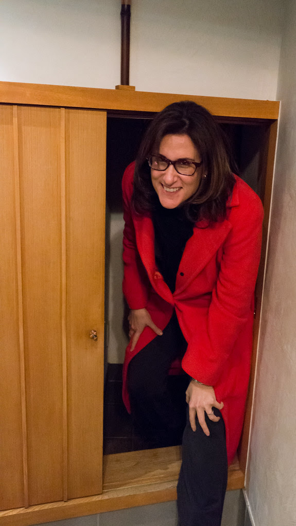 When we arrived, our driver pointed up to make sure we understood that the restaurant was on the third floor of what appeared to be a nondescript office building. After exiting the elevator, we spotted the kanji that matched the picture our hotel concierge had provided us, fumbled with the door,[1] and then nearly stumbled right on top of six diners seated along a wooden counter in a room smaller than many walk-in closets. A hostess politely shooed us back outside, then directed us across the landing to what appeared to be a cupboard built into the wall. We assumed she was going to put our coats away there. Instead, she opened the door and beckoned us inside.